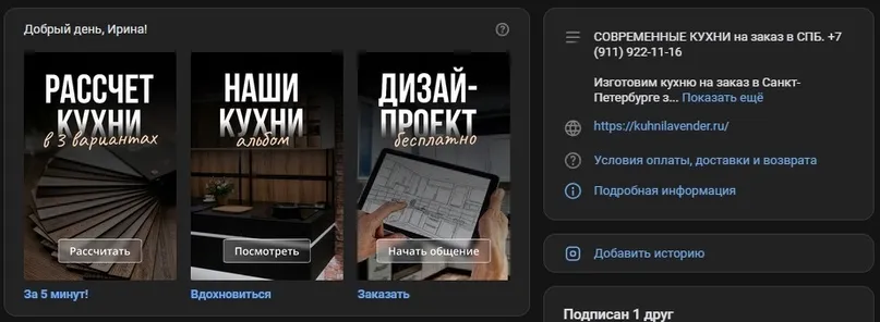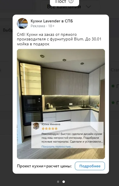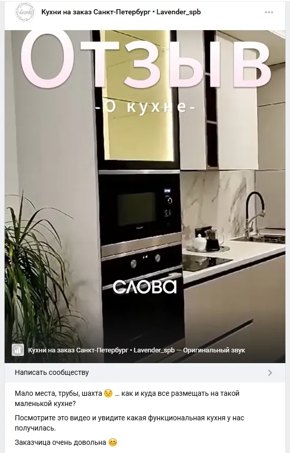 Таргетированная реклама в связке с контентом работает лучше, чем без него. Подписчикам есть ради чего остаться в группе даже после заказа кухни, а те, кто еще не заказал её “подогреваются” вашими записями с отзывами довольных клиентов.