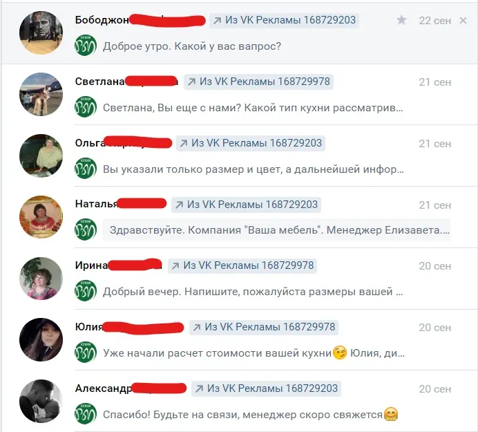 Это сообщения людей, которые откликнулись на рекламу. Это всё живые люди, заинтересовавшиеся рекламным предложением.