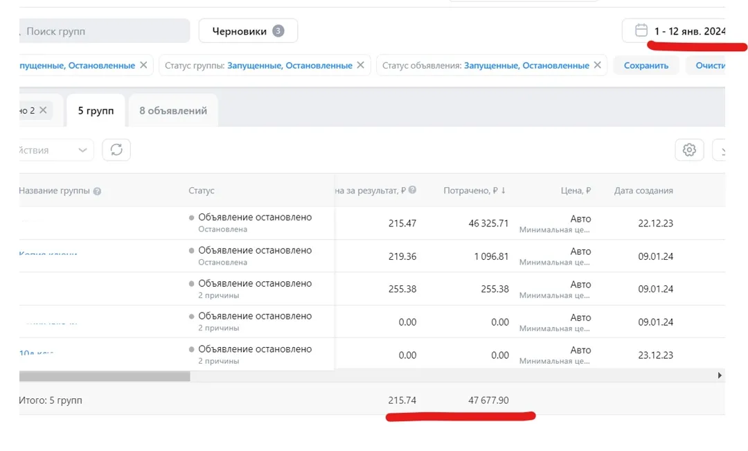 Сначала Заказчик обратился ко мне просто за личной консультацией. Во время нее мы вместе настроили кампании, которые успешно работали некоторое время. Далее аудитории и креативы выгорели. Заказчик повторно купил консультацию, где мы переделали кампании, обновили тексты и аудитории.