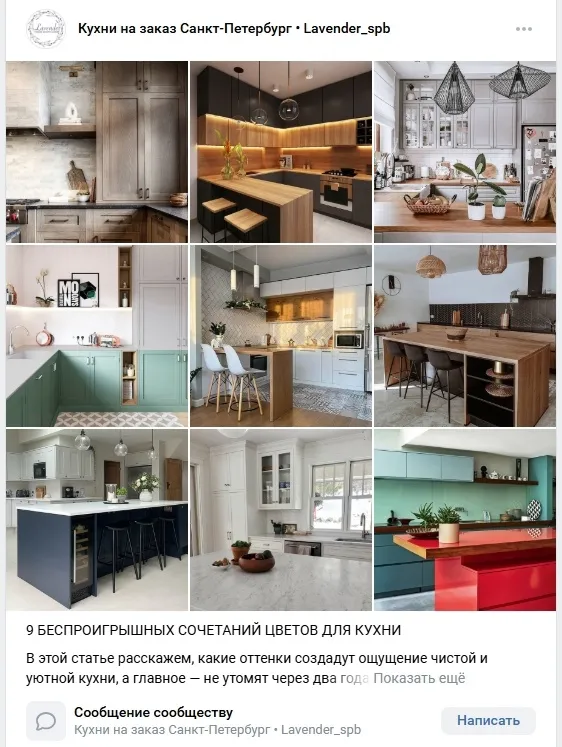 Останется ли кто-то в группе, будет обсуждать, общаться? Скорее всего нет. Плюс покупка кухни — это не покупка табуретки. Всё таки это большая статья расходов, пустой группе сложно доверять. Страх потратить деньги на что-то некачественное подтолкнет будущего клиента нажать крестик в верхнем правом углу. Поэтому не упускайте из вашего плана продвижения контент.